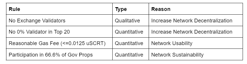 By outlining the requirements to join the validator set. stkd-SCT can create transparency and foster inclusion into the staking derivative set. Exclusion from the list is not permanent, and is updated every quarter based on validators with the highest scores on the below rules. The barrier to entry may require validators to compromise on fees, to participate in governance, or to make their infrastructure more robust.