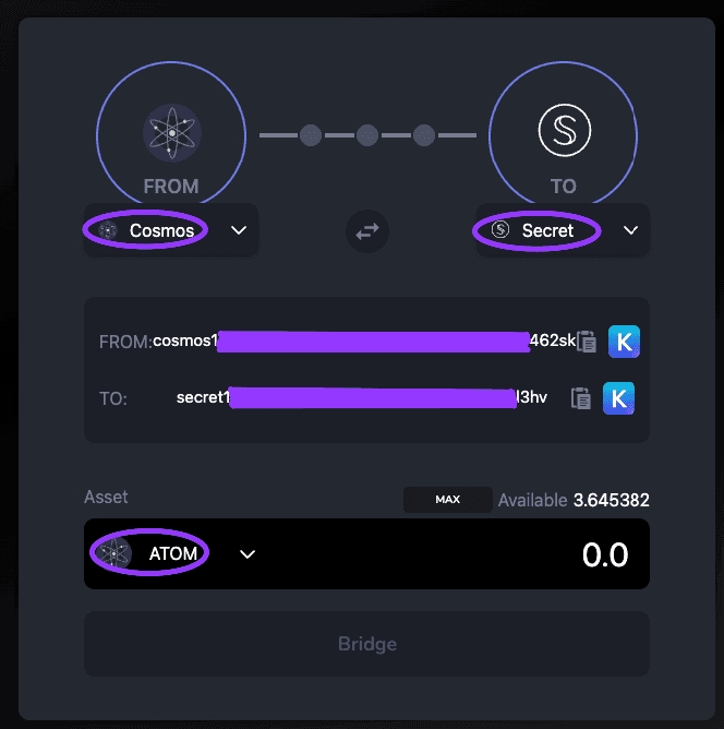 Bridge on app.shadeprotocol.io/bridge (From: Noble / To: Secret Network)