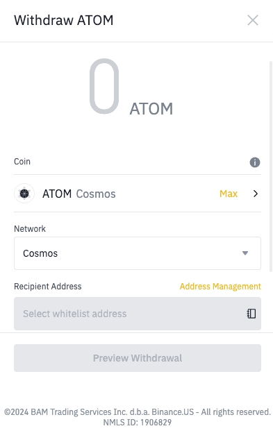 Copy your Cosmos address and go back to Binance (withdraw), then Paste this address on the Recipient Address. Use a memo if needed.