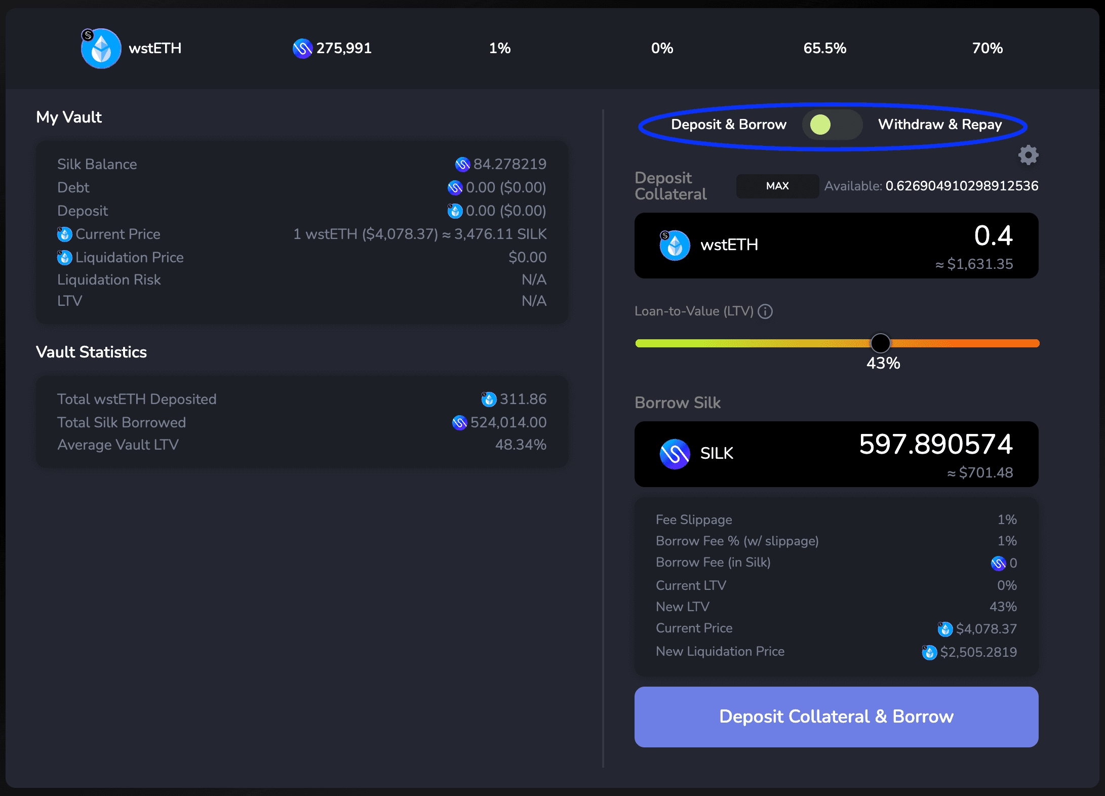 Now you can enter the total amount of SILK to borrow or use the Loan-to-Value (LTV) sliding bar.