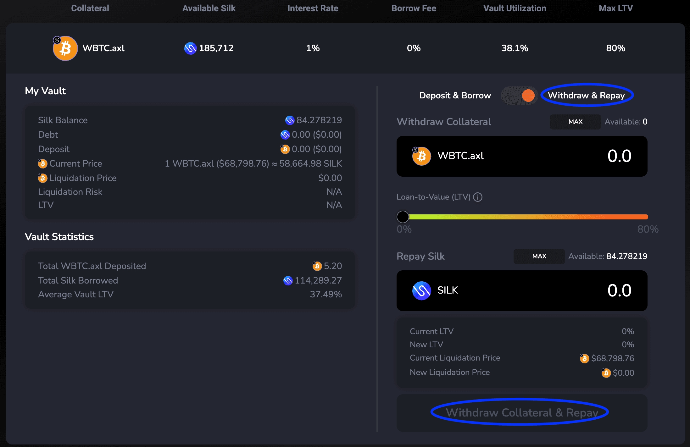 The LTV is the most important part of this process because it reflects the risk spectrum you choose for the loan. Max LTV is a higher risk for the liquidation of the asset if it’s price drops (in which case, you keep your Silk but the collateral is lost).