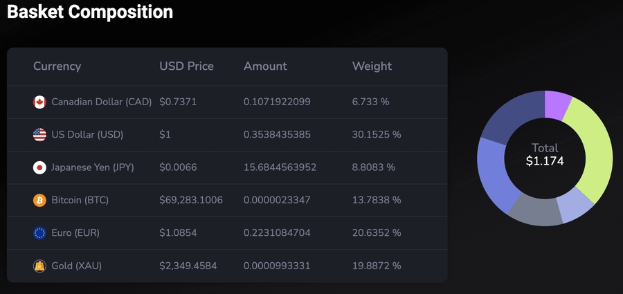Basket composition criteria is based on GDP, degree of monetary policy health, and the efficiency of the underlying economy, as well as growth potential. Bitcoin and gold are included as inflationary hedges.